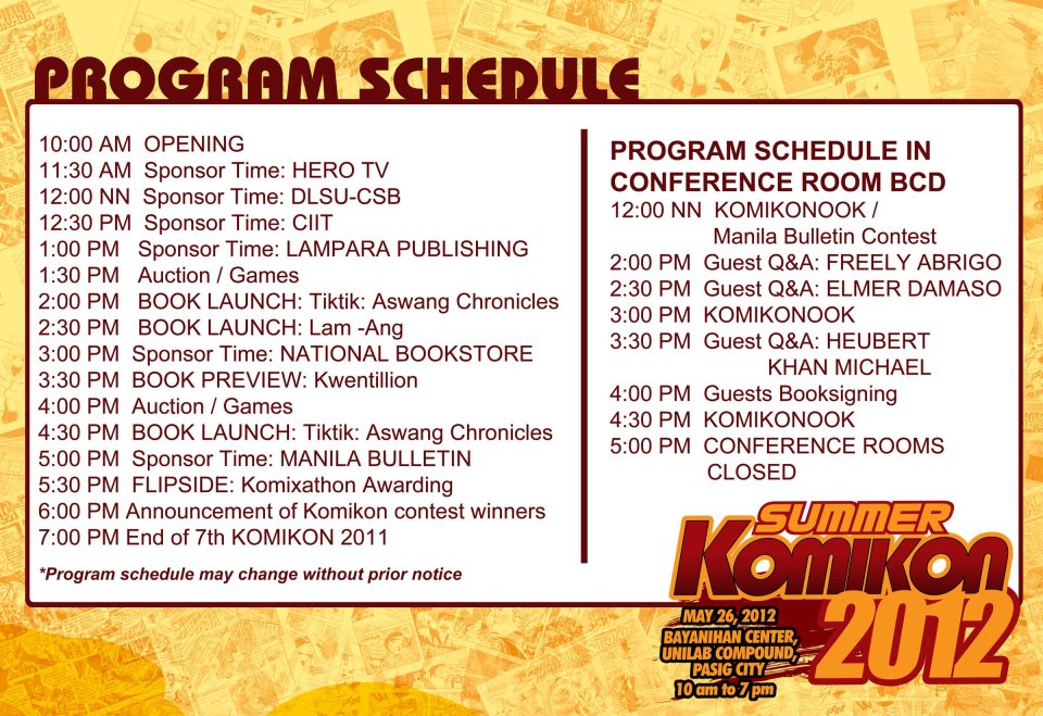 Do you want to know what’s happening on stage? Want to find out when your favorite artists will be interviewed? Then check out our program for Summer Komikon 2012!